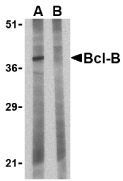 Members in the Bcl-2 family are critical regulators of apoptosis by either inhibiting or promoting cell death. Bcl-B is a recently discovered anti-apoptotic member of the Bcl-2. Unlike the mouse homolog (also known as Diva/Boo) which is predominantly expressed in ovary and testis, the human Bcl-B protein is widely expressed. Also, the human Bcl-B functions by binding to and suppressing the apoptotic activity of Bax, whereas the mouse homolog binds Bak and also interacts with the apoptosis protein Apaf-1. Despite its predicted molecular weight, Bcl-B is often at higher molecular weights, presumably due to post-translational modifications.