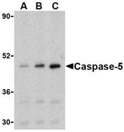 Application : Casp-5 antibody can be used for the detection of caspase-5 by Western blot at 0.5 - 1 µg/mlDepending on cell lines or tissues used, other cleavage products may be observed.