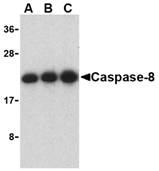 Left: Western blot analysis of caspase-6 in Jurkat cell lysate with caspase-6 antibody at (A) 0.5, (B) 1, and (C) 2 µg/ml.