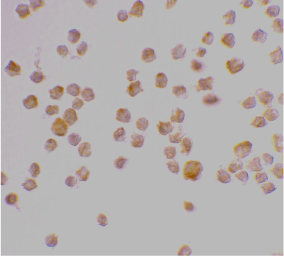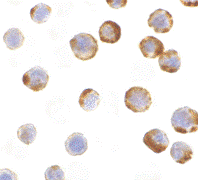 Below: Immunocytochemistry of caspase-5 in P815 cells with caspase-5 antibody at 2 µg/ml.