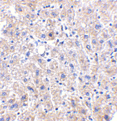 Below: Immunohistochemistry of DRAM in human liver tissue with DRAM antibody at 2.5 µg/ml.