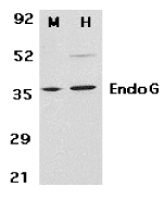 Left: Western blot analysis of EndoG in mouse (M) 3T3 and human (H) HepG2 cell lysates with EndoG antibody at 2 µg/ml.