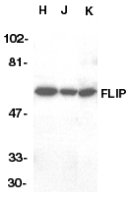 Left: Western blot analysis of FLIP in HeLa (H), Jurkat (J), and K562 (K) whole cell lysate with FLIP antibody at 1:1000 dilution.