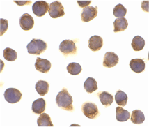 Below: Immunocytochemistry of FLIP in Jurkat cells with FLIP antibody at 10 µg/ml.
