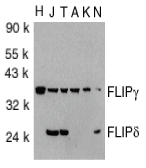 Application : FLIP can be used for detection of FLIP by Western blot at 1:1000 dilution. 35 kDa and 25 kDa bands can be detected. antibody recognizes human and murine FLIPy and FLIPd but not FLIPa and FLIPd.