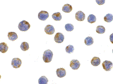 Below: Immunocytochemistry of LAMP-2 in HepG2 cells with LAMP-2 antibody at 10 µg/ml.