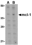 Left: Western blot analysis of Mcl-1 in Raji cell lysates with Mcl-1 antibody at (A) 1 and (B) 2 µg/ml.