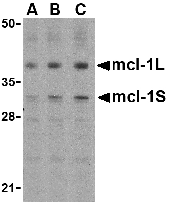 Left: Western blot analysis of Mcl-1 in Raji cell lysates with Mcl-1 antibody (IN) at (A) 0.5, (B) 1, and (C) 2 µg/ml.
