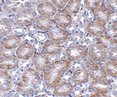 Below: Immunohistochemistry of MTCH2 in mouse kidney tissue with MTCH2 antibody at 5 µg/ml.