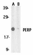 Left: Western blot analysis of PERP expression in A431 whole cell lysates in the absence (A) and presence (B) of blocking peptide with PERP antibody at 1 µg /ml.