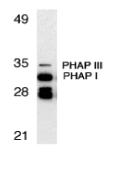 Application : PHAP antibody can be used for detection of PHAP I and PHAP III by Western blot at 0.5 to 2 µg/ml.At approximately 35 kDa and 32 kDa a band can be detected.