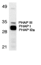 Application : PHAP antibody can be used for detection of all three identified isoforms of PHAP including PHAP I, PHAP I2a, and PHAP III by Western blot at 0.5 to 2 µg/ml.