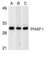 Application : PHAP I antibody can be used for detection of PHAP I by Western blot at 0.5 to 2 µg/ml.A band at approximately 32 kDa can be detected. This polyclonal antibody has no cross-reaction to PHAP I2a and PHAP III.