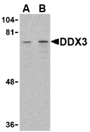 DDX3 contains all of the motifs of the DEAD-box family of RNA helicases, including the Asp-Glu-Ala-Asp sequence that gives the protein family its name and distinguishes it from other RNA helicases (1,2). DDX3 is localized to the X chromosome and has a highly conserved functional homolog (DBY) on the Y chromosome (3). DDX3 is thought to be involved in RNA splicing, RNA transport, and translation initiation (4). It has also been shown to be involved in cell growth control and is deregulated in hepatitis virus-associated hepatocellular carcinoma (5). Recent experiments suppressing DDX3 expression blocked HIV-1 RNA export from the nucleus, suggesting that DDX3 functions as a shuttling protein that transports the HIV-1 protein Rev and its cofactor CRM1 from the nucleus to the cytoplasm (6).