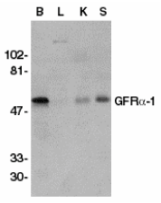 Application : GFR alpha 1 antibody can be used for detection of GFR alpha 1 by Western blot. The amino acid sequence of immunogenic peptide is identical to those of mouse and rat and the antibody recognizes GFR alpha 1 from human, mouse and rat origins.