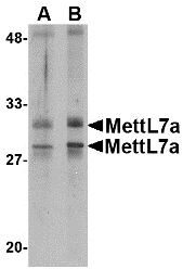 MettL7A belongs to the methyltransferase superfamily. It is a probable methyltransferase. Methyltransferase is a type of transferase enzyme which transfers a methyl group from a donor to an acceptor. Often methylation occurs on nucleic bases in DNA or amino acids in protein structures. DNA methylation is often utilized to silence and regulate genes without changing the original DNA sequence. DNA methylation may be necessary for normal growth from embryonic stages in mammals. When mutant embryonic stem cells lacking the murine DNA methyltransferase gene were introduced to a germline of mice they caused a recessive lethal phenotype. Methylation may also be linked to cancer development as methylation of tumor suppressor genes promotes tumorgenesis and metastasis. At least two isoforms of MettL7A are known to exisit. This antibody is predicted to not cross-react with MettL7B.