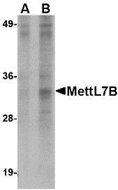 Left: Western blot analysis of MettL7B in Jurkat lysate with MettL7B antibody at (A) 2 and (B) 4 µg/ml.