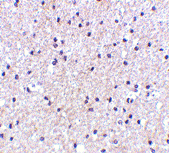 Below: Immunohistochemistry of MORF4 in human brain tissue with MORF4 antibody at 5 µg/ml.