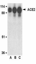 Application : ACE2 antibody can be used for the detection of ACE2 by Western blot at 0.5 to 2 µg/ml.A 90 kDa band can be detected. Anti-ACE2 has no cross response to ACE1.
