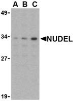 Left: Western blot analysis of Nudel in Jurkat whole cell lysate with Nudel antibody at (A) 0.5, (B) 1, or (C) 2 µg/ml.